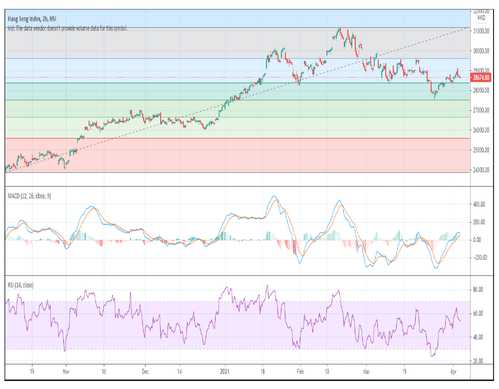All the positive price action in the second half of 2020 was carried forward in 2021 as HSI kick-off the year relatively well, able to break up the 30,000 level in January. The price retreated afterwards in the end of January when MACD bearish crossover was formed, while RSI indicators had also shown overbought signal for couple of days. After hitting the support level around 28,000, prices bounced back to reach the YTD high level of 31,183.36. However, price dropped again in the end of February as RSI showed an overbought signal while MACD returned to its bearish crossover signal.