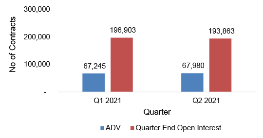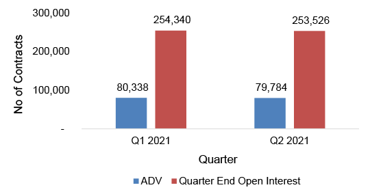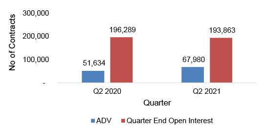 - While quarter-end open interest grew 4.17% from 243,382 contracts in Q2 2020 to 253,526 contracts in Q2 2021, the ADV had grown impressively around 19.76% from 66,619 contracts in Q2 2020 to 79,784 contracts in Q2 2021.