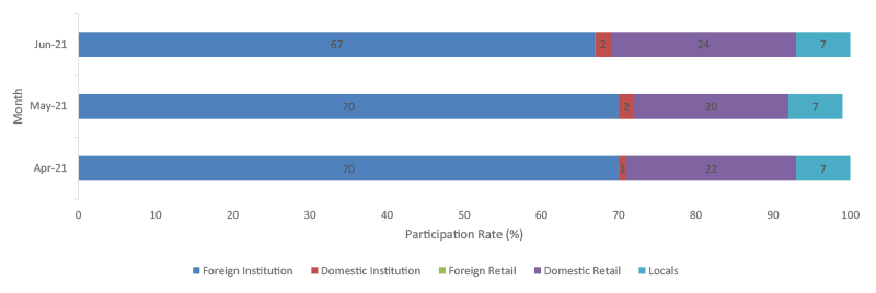 - Although the market composition is similar to the last quarter, the participation rate had shown some changes as foreign institutions, which remained to be the largest participants in FKLI market in Q2 2021, had surpassed the 70% mark in terms of market share.