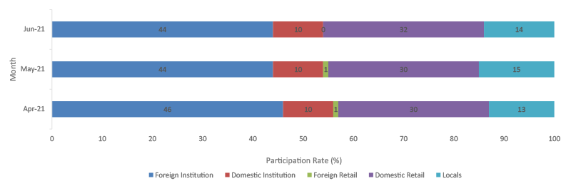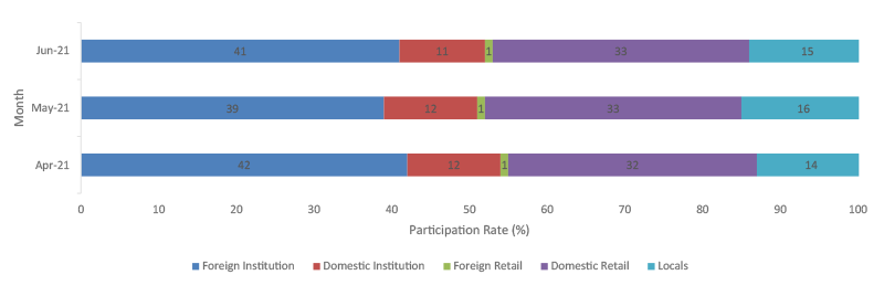 - Behind foreign institution was the domestic retail which made up around 30 – 32% of the market share in Q2 2021, while local participants, which lied in third place, made up around 13 – 15% of the market share.