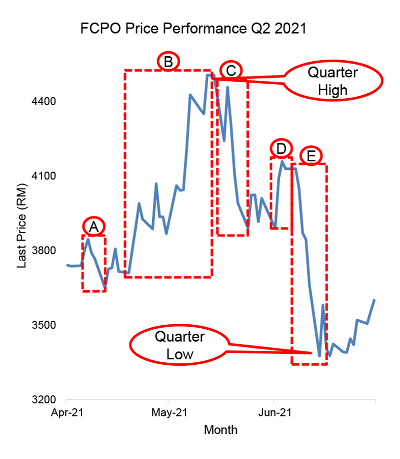 7 Apr 21 to 12 Apr 21 (-5.07%) FCPO dropped due to the overnight weakness in rival soybean oils and crude oil market. |