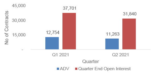 - ADV dropped from 12,754 contracts in Q1 2021 to 11,263 contracts in Q2 2021, while quarter-end open interest declined from 37,701 contracts in Q1 2021 to 31,840 contracts in Q2 2021.
