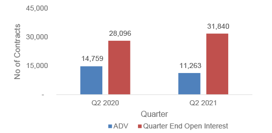 - However, the quarter-end open interest showed 13.33% improvement from 28,096 contracts in Q2 2020 to 31,840 contracts in Q2 2021.